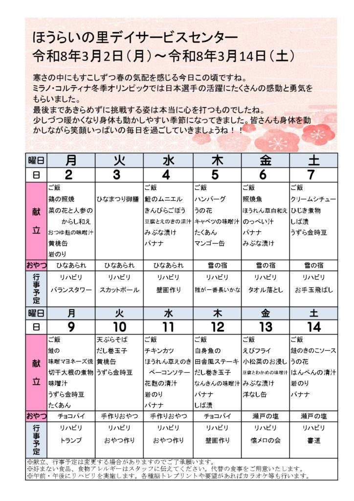 2026年3月2日~3月14日のお知らせ