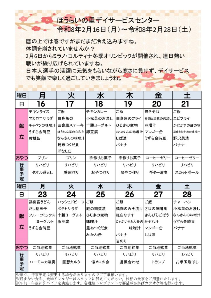 2週間分のレクリエーションと献立の予定をお知らせします