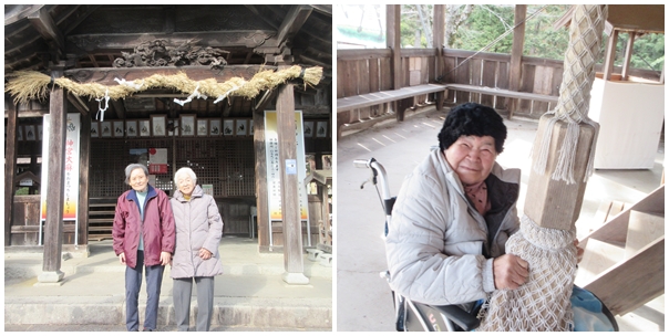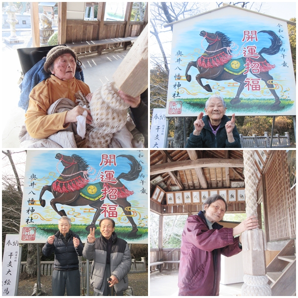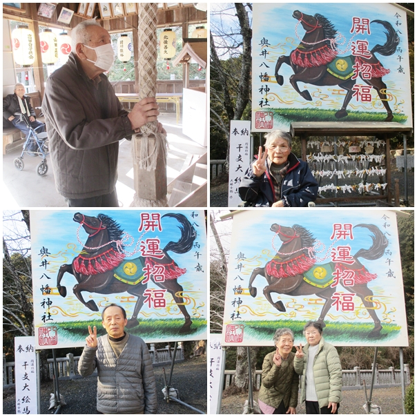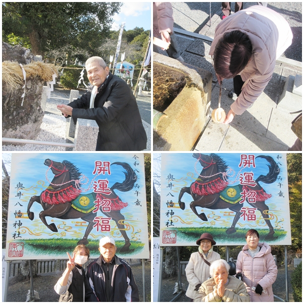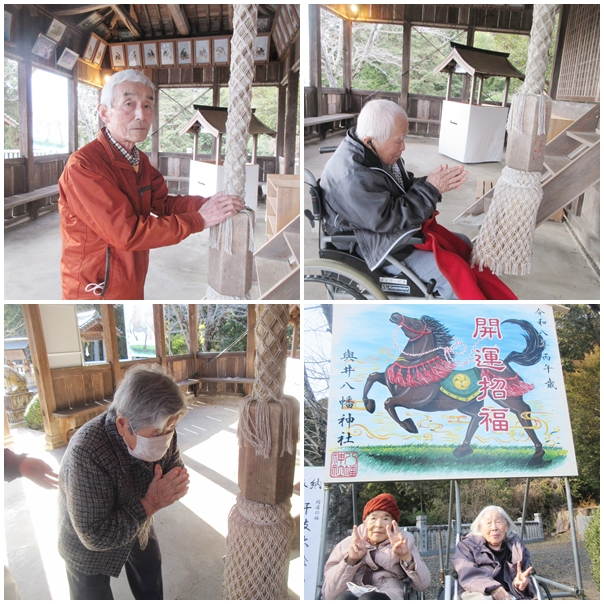 1月は屋外機能訓練の一環として與井の八幡神社へ初詣に出かけ、皆さん『家内安全』や『健康祈願』など、さまざまなお願い事をされていました。