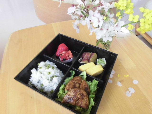 メニューは『桜ごはん』『ハンバーグ』『かき揚げ』『がんもどき』『人参といんげんの煮物』『いちごとショートケーキ』でした。