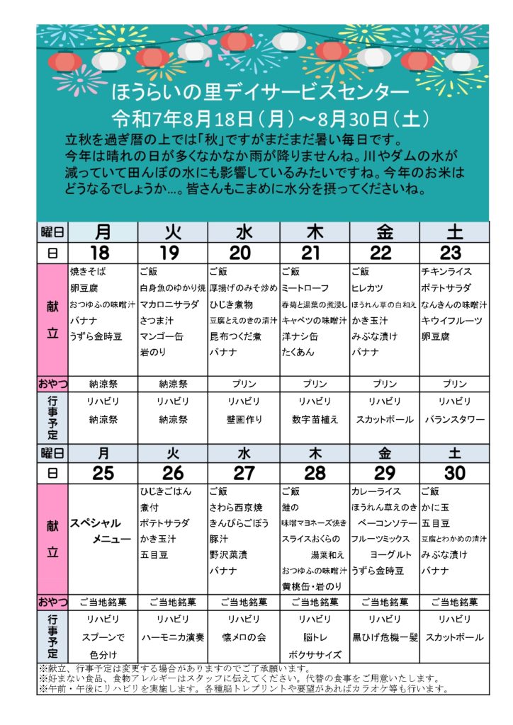 2週間分のレクリエーションと献立の予定をお知らせします