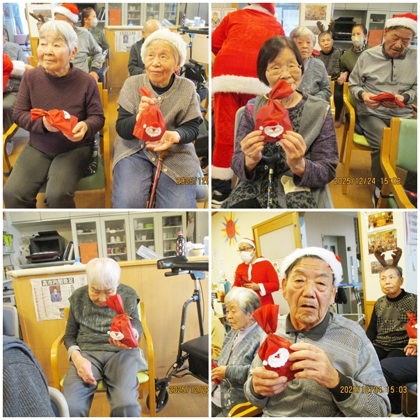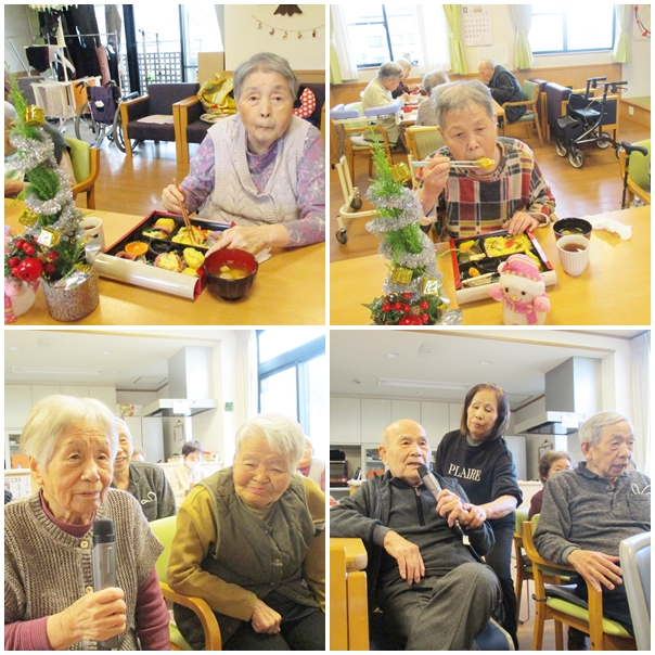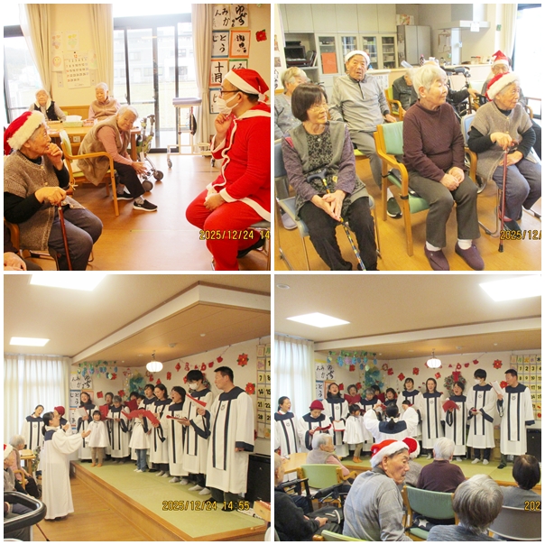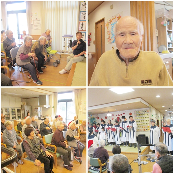 まずは忘年会。皆さまでお弁当を囲み、いつもよりちょっとした特別感に笑顔がこぼれました。その後は恒例のカラオケ大会。懐かしい曲やお気に入りの歌で大いに盛り上がりました。歌声と拍手が響く、にぎやかで温かい時間となりました。そしてクリスマス会では、今年も福音教会の皆さまが来てくださり、美しい歌声を届けてくださいました。優しいハーモニーに耳を傾けながら、利用者さまもスタッフも心がほっと和むひとときに。
