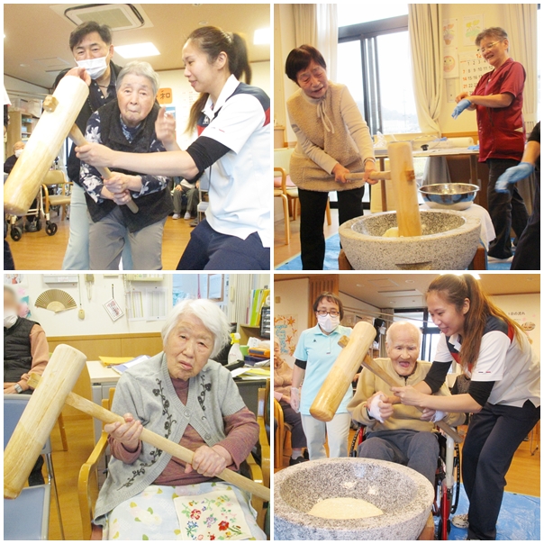 臼と杵を準備し、いよいよ餅つきが始まると、フロアには「よいしょ」の掛け声とともに活気が広がりました。男性の利用者さんはもちろん、女性の利用者さんも力いっぱい挑戦されました。皆さまの真剣な表情と笑顔がとても印象的でした。