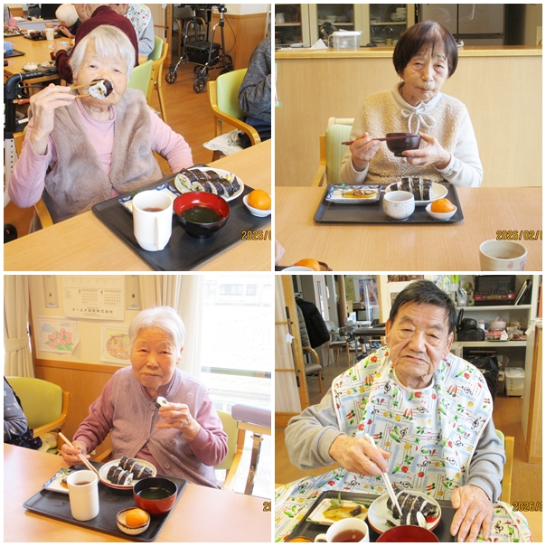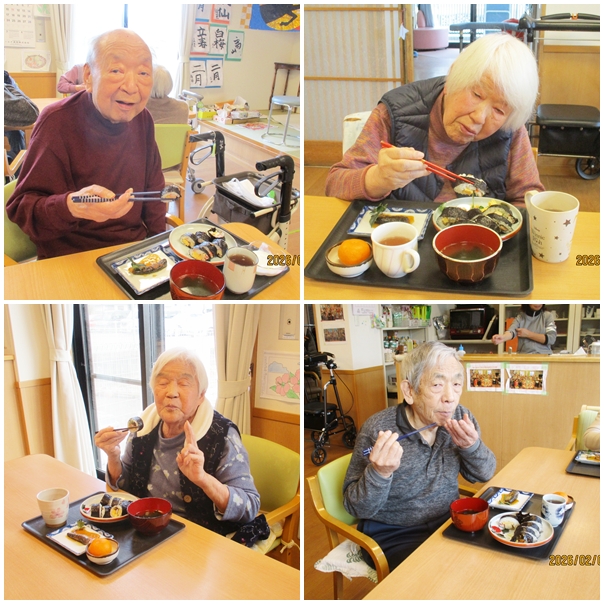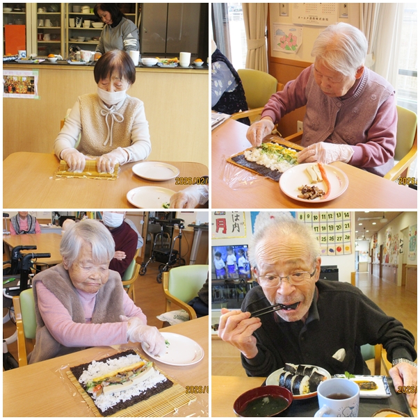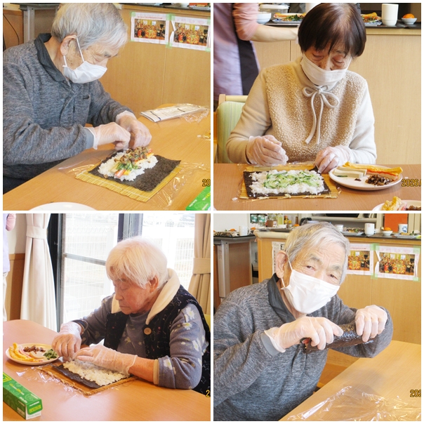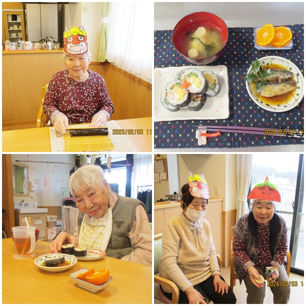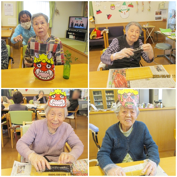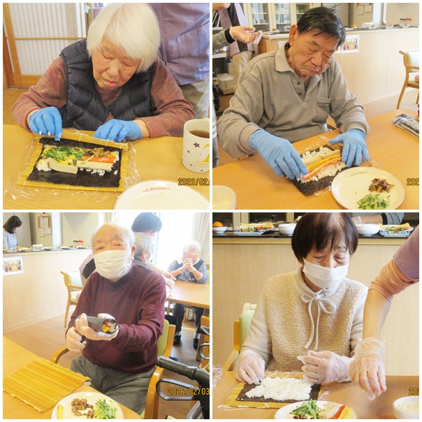 節分の日は、皆さんで巻き寿司作りからスタートしました。